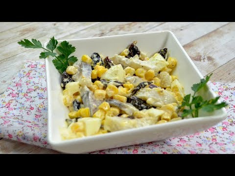 Wymoczone w wodzie płaty śledziowe odsączamy i kroimy w paski po czym wrzucamy do miski. Czerwoną cebulę drobno siekamy i łączymy ze śledziami. Suszone śliwki kroimy w paski, po czym dodajemy do śledzi i cebuli. Ugotowane na twardo i obrane ze skorupek jajka kroimy w większą kostkę i wrzucamy do pozostałych składników sałatki. Na końcu do sałatki dodajemy odsączoną z zalewy kukurydzę oraz majonez, całość doprawiamy solą oraz czarnym pieprzem i dokładnie mieszamy. Tak przygotowaną sałatkę wstawiamy do lodówki na pół godziny aby wszystkie smaki się przegryzły.
