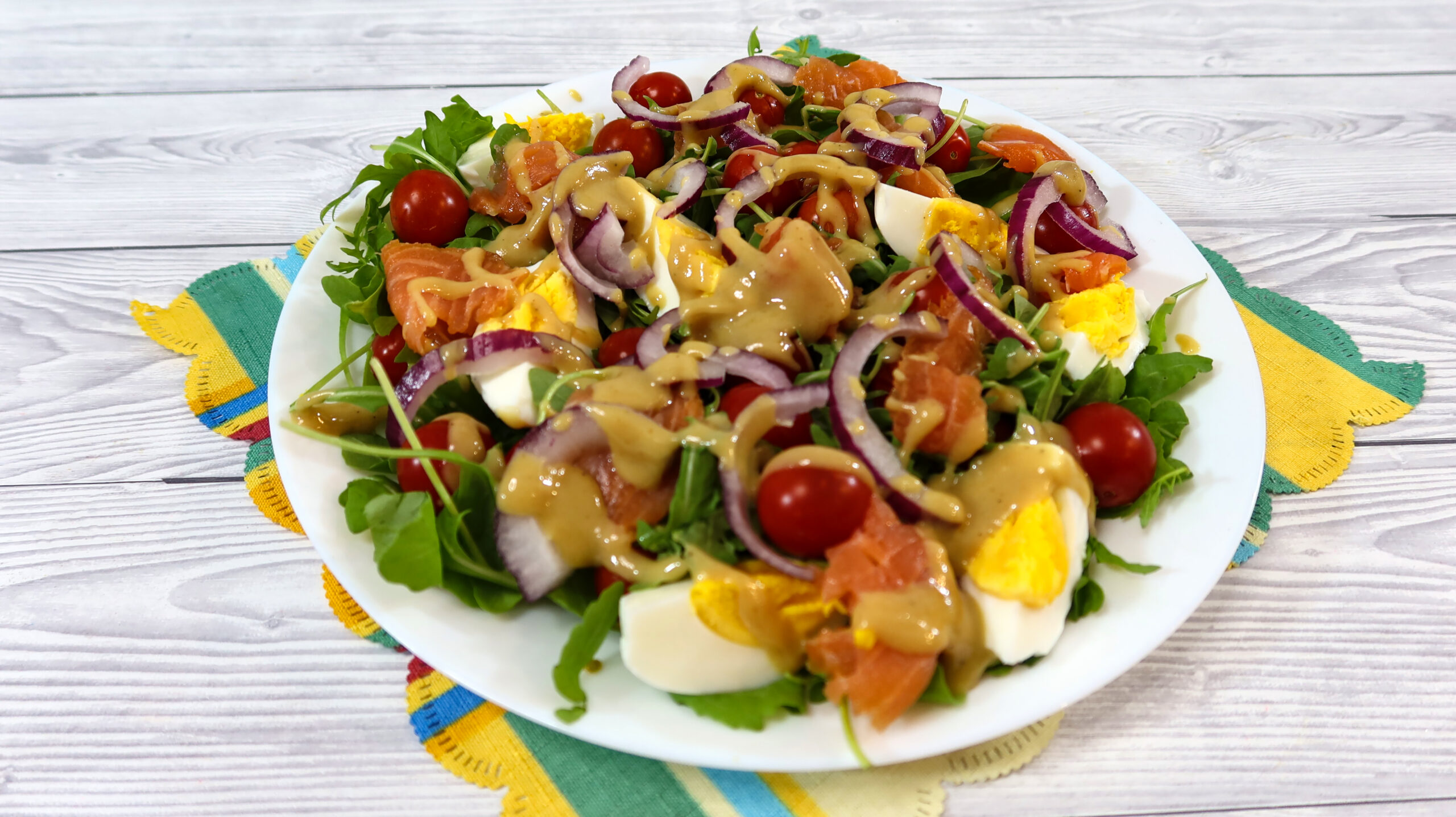Sałatka z wędzonym łososiem, jajkiem i sosem miodowo-musztardowym – lekka, pyszna i pełna smaku