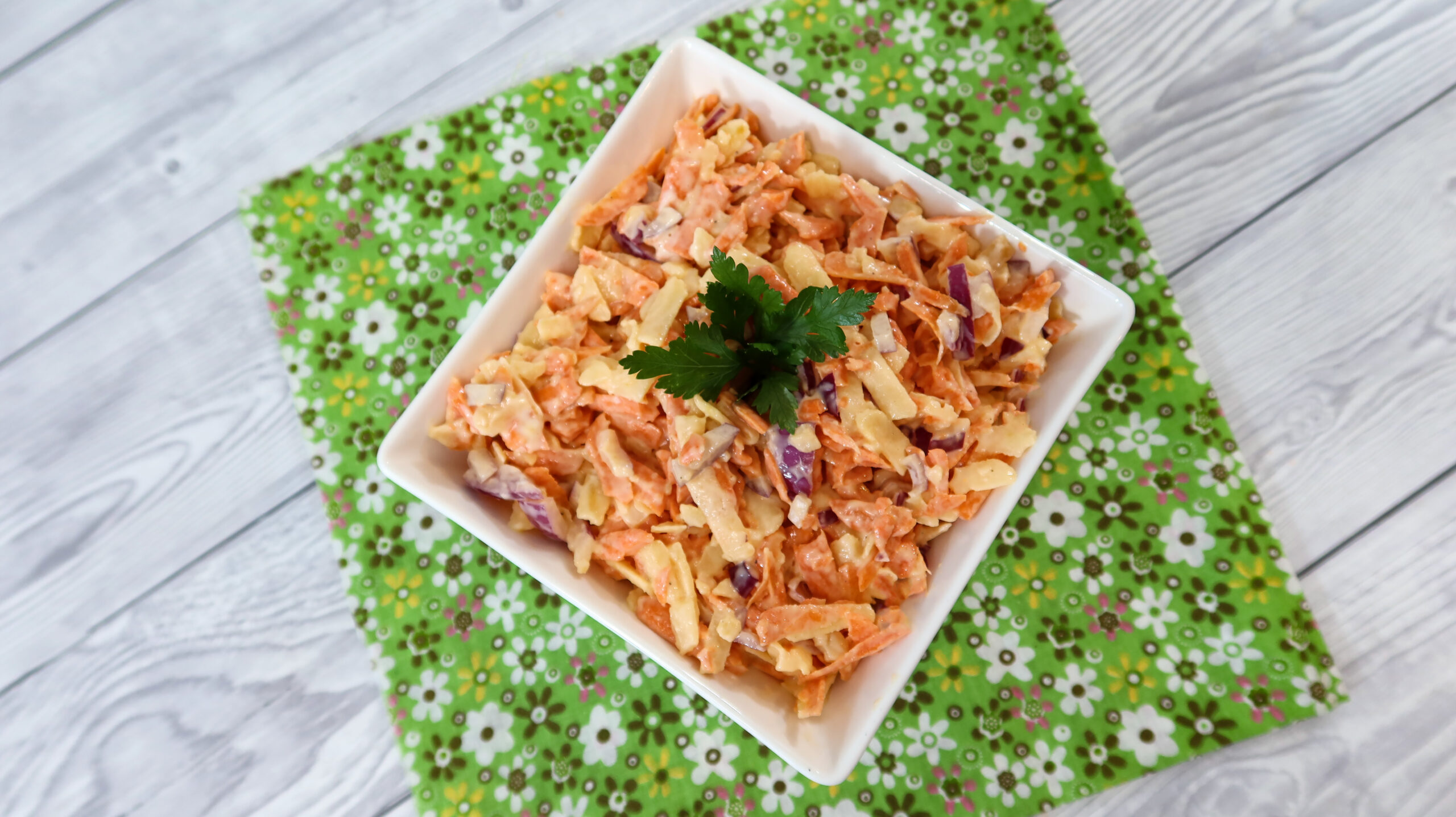 Surówka świetnie sprawdzi się zarówno do mięs, ryb, jak i do pieczywa. Dzięki połączeniu marchewki, jabłka i delikatnej cebuli z jogurtem i majonezem powstaje kremowa, lekko słodka, a jednocześnie wyrazista w smaku sałatka, która pasuje na każdą okazję – od codziennego obiadu po domowe przyjęcia.