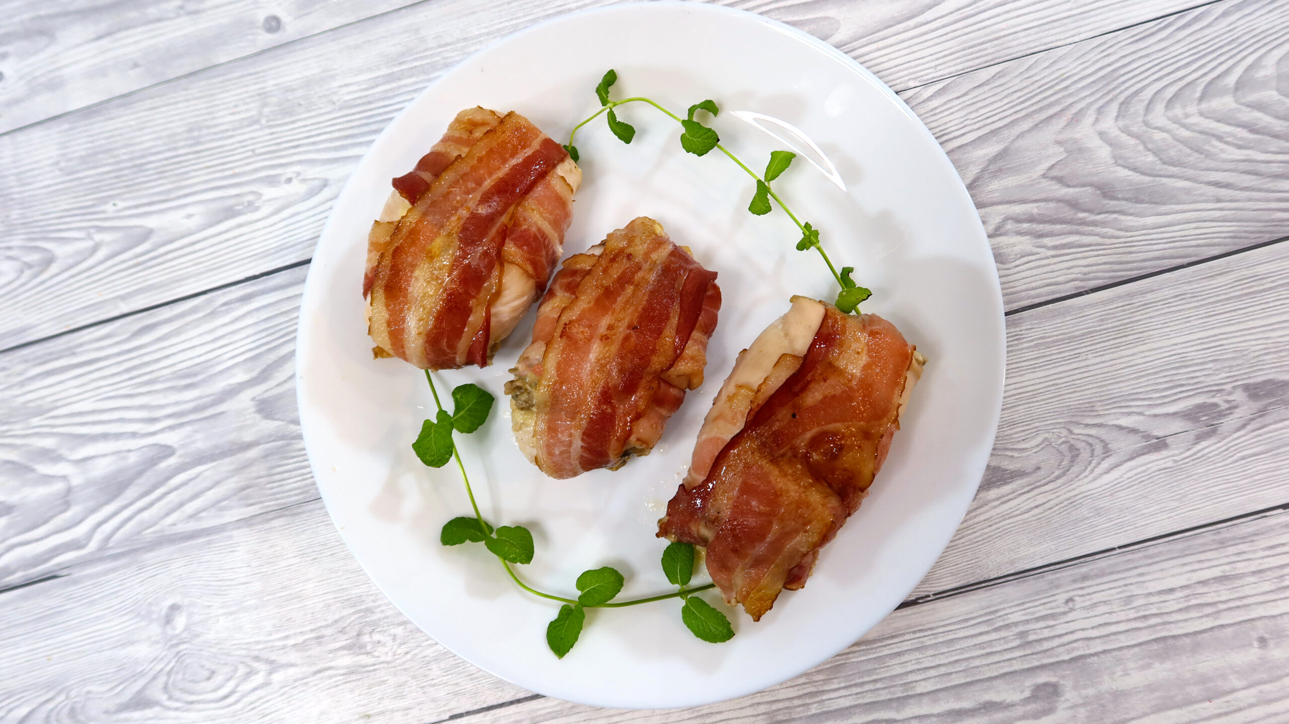 Na każdy kawałek mięsa nakładamy niewielką porcję farszu, następnie pierś zwijamy ciasno w roladkę. Każdą roladkę owijamy 2 plastrami boczku: jeden plaster układamy wzdłuż roladki, drugi owijamy wszerz, aby wszystko dobrze się trzymało i nie rozpadło podczas pieczenia, dzięki temu boczek trzyma formę, a po upieczeniu robi się lekko chrupiący i aromatyczny.