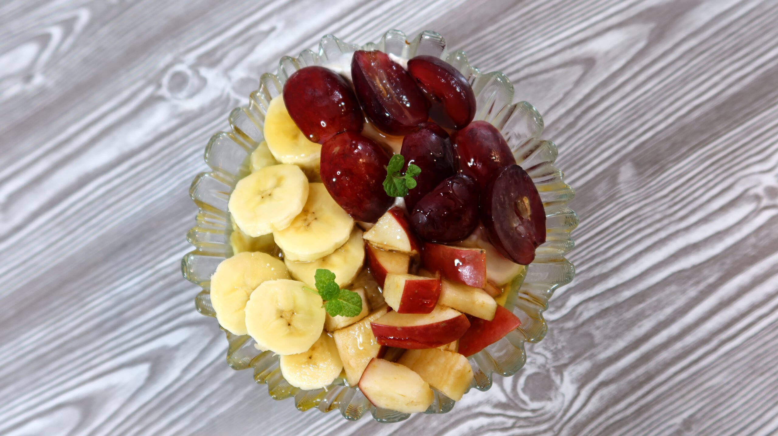 Obranego banana, kroimy w plastry. Umyte jabłk0 razem ze skórką kroimy w większą kostkę. Winogrona kroimy na połówki.